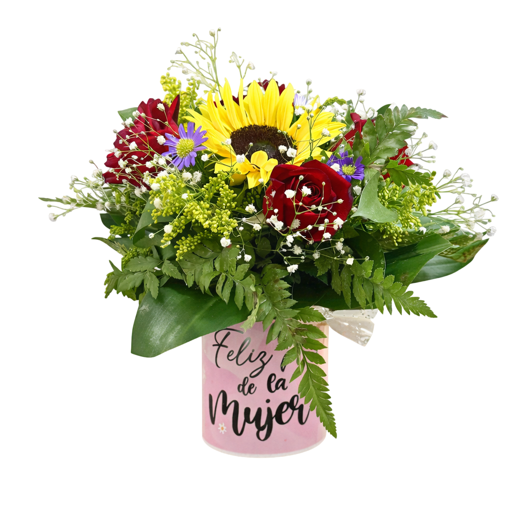 Sorprende con un regalo lleno de color y elegancia con nuestro hermoso arreglo floral en mug. Diseñado para transmitir alegría y cariño, este arreglo combina la calidez de los girasoles con la pasión de las rosas rojas y el encanto de las flores silvestres, todo en un delicado mug con un mensaje especial.