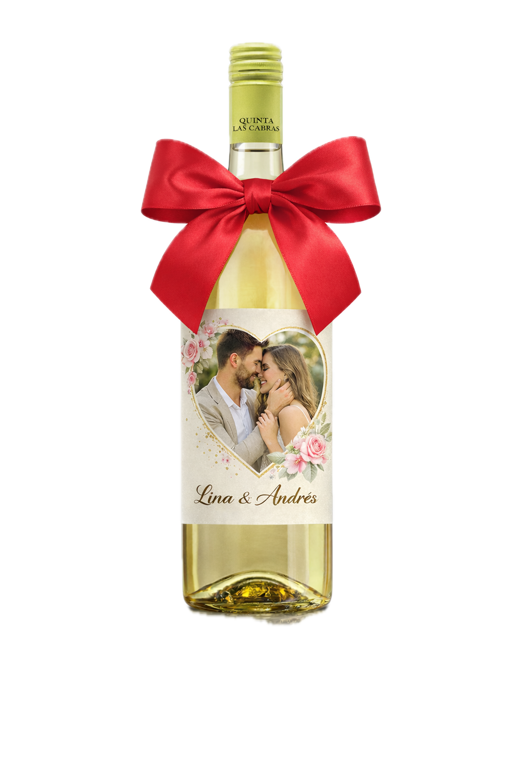 Convierte una botella de vino blanco en un recuerdo único. Este detalle especial incluye una etiqueta completamente personalizada con la foto que tú elijas, creando un regalo elegante, original y hecho a tu medida.